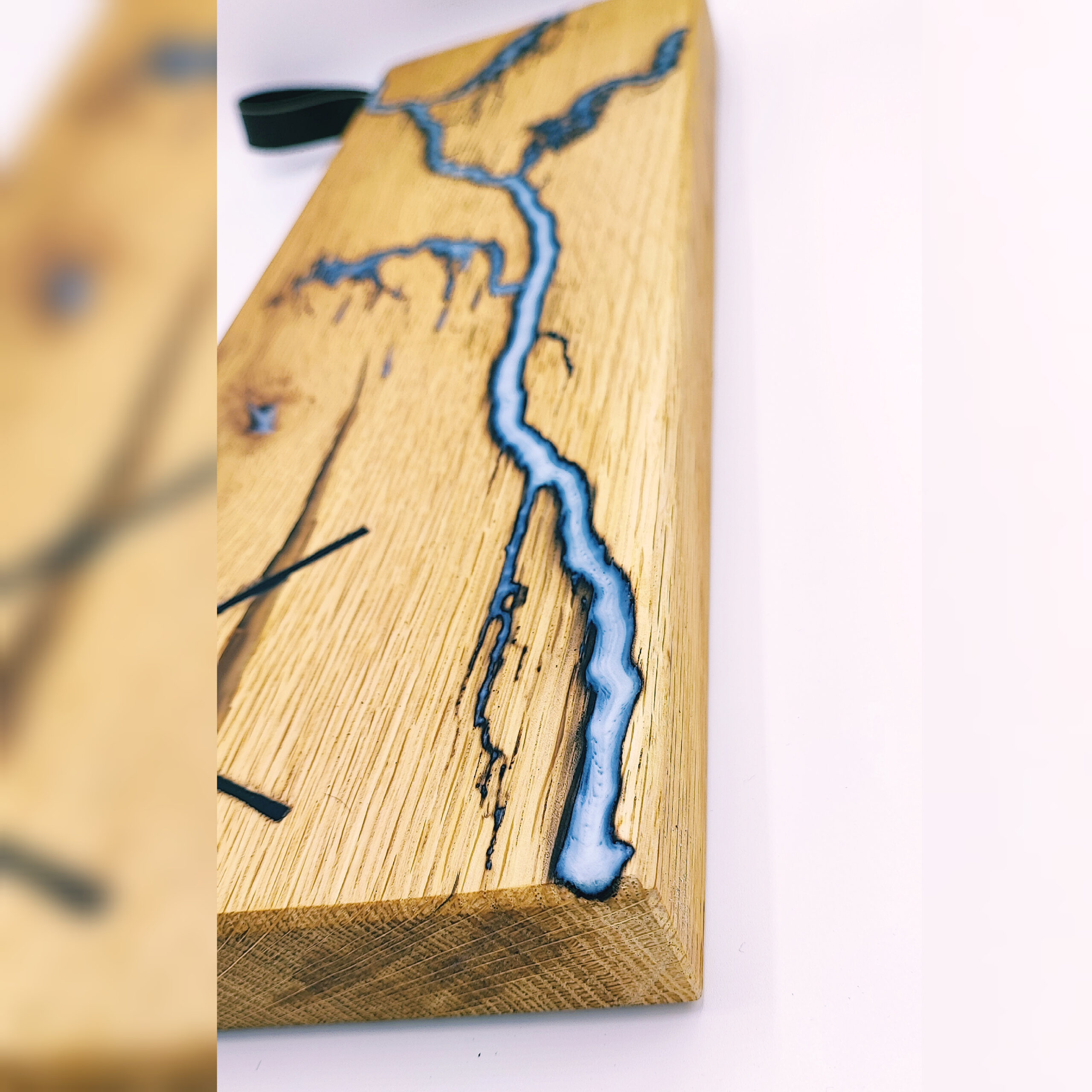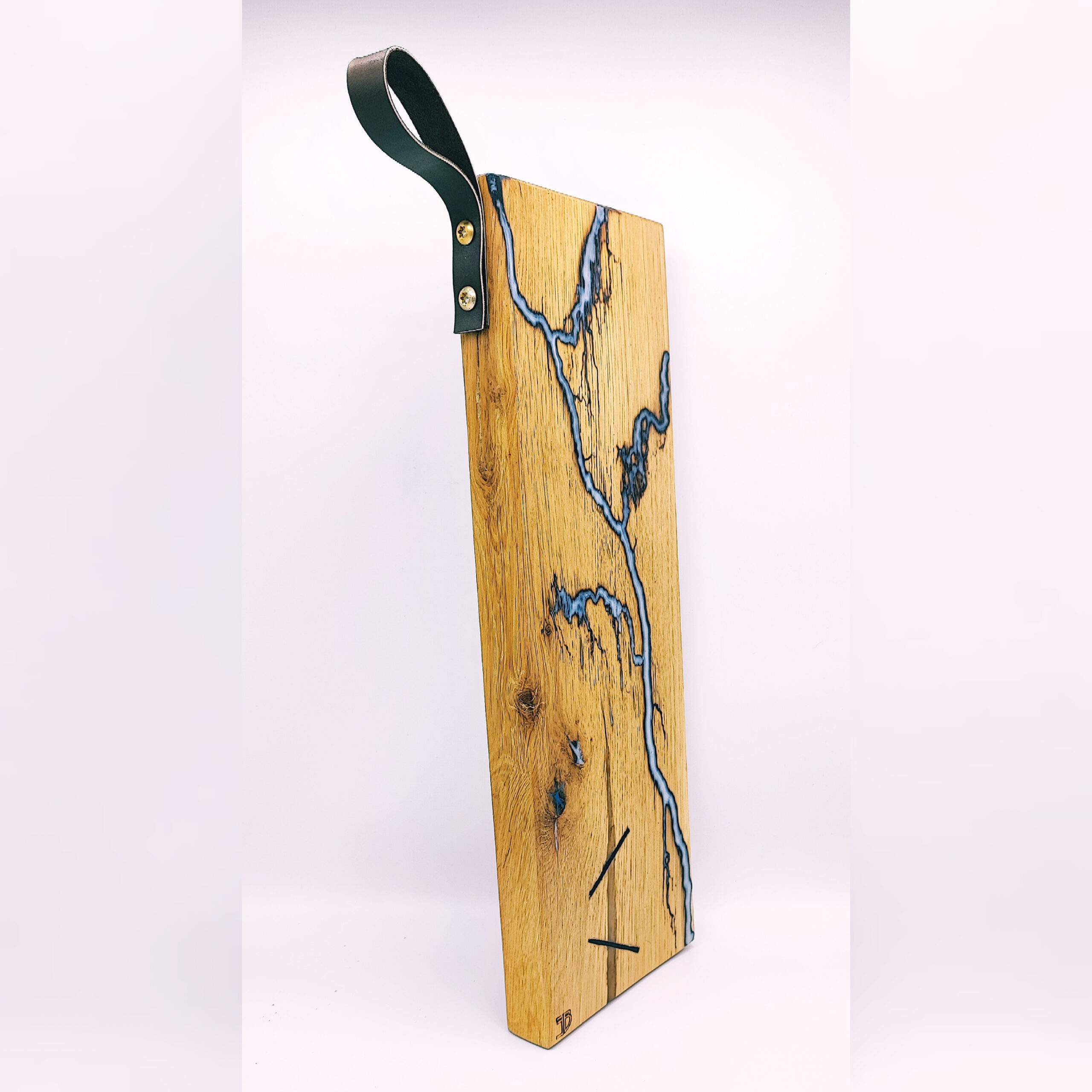 Tagliere in legno di rovere, caratterizzato da inserti in legno d’ebano. Il tagliere è decorato con la tecnica Lichtenberg, che crea affascinanti pattern simili a fulmini sulla superficie. Queste venature sono rifinite con resina grigia, che conferisce un aspetto elegante e moderno al pezzo. La combinazione di materiali e tecniche rende il tagliere un oggetto sia funzionale che decorativo.