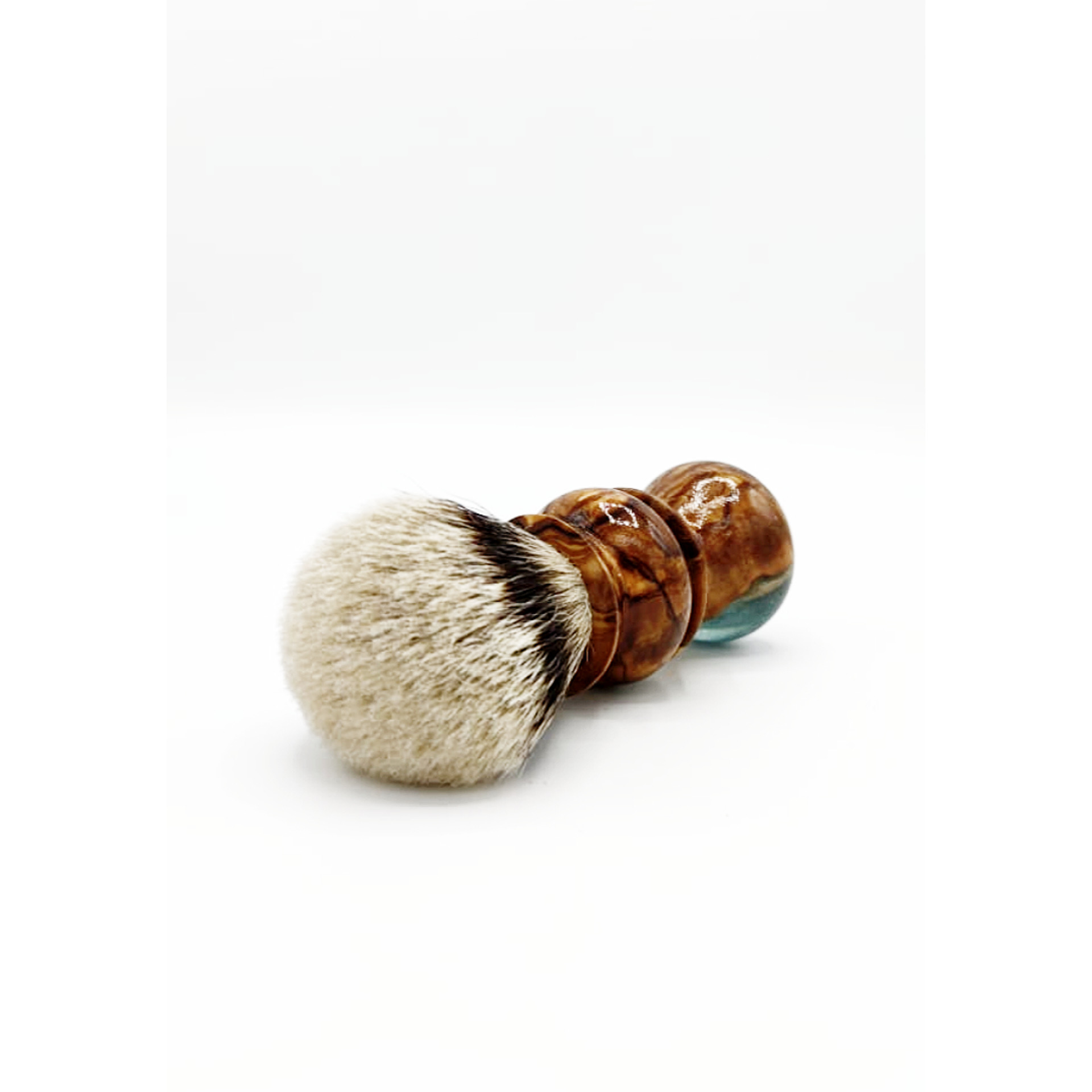 Realizzato in legno di ulivo e resina azzurra semitrasparente con ciuffo in tasso a doppia banda , ovviamente tutto fatto a mano
