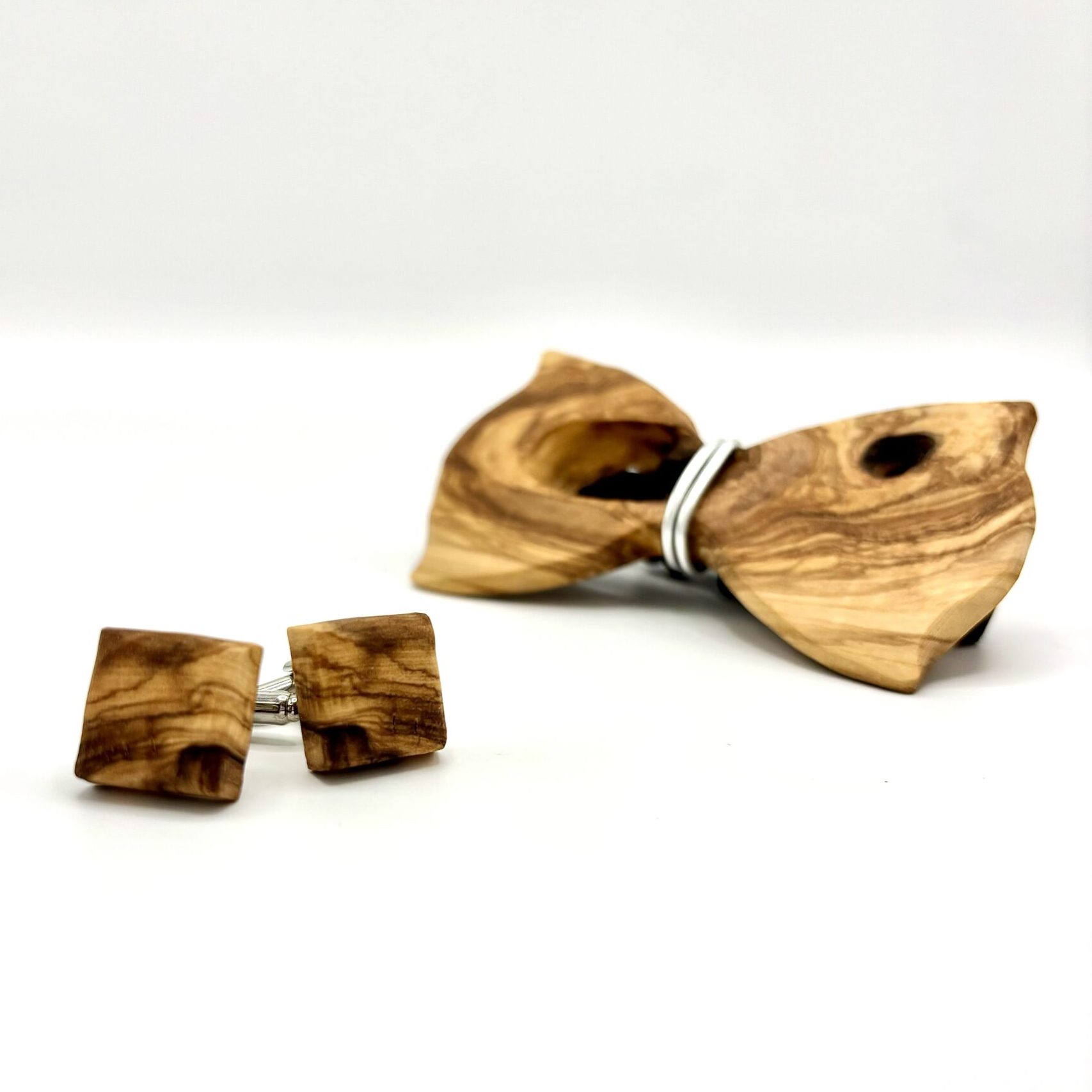 Esalta il tuo stile con il nostro papillon in legno di radica d’ulivo, arricchito dall’inserto in acciaio, abbinato ai gemelli coordinati. Questo set artigianale unisce eleganza e unicità, perfetto per chi desidera distinguersi con classe.